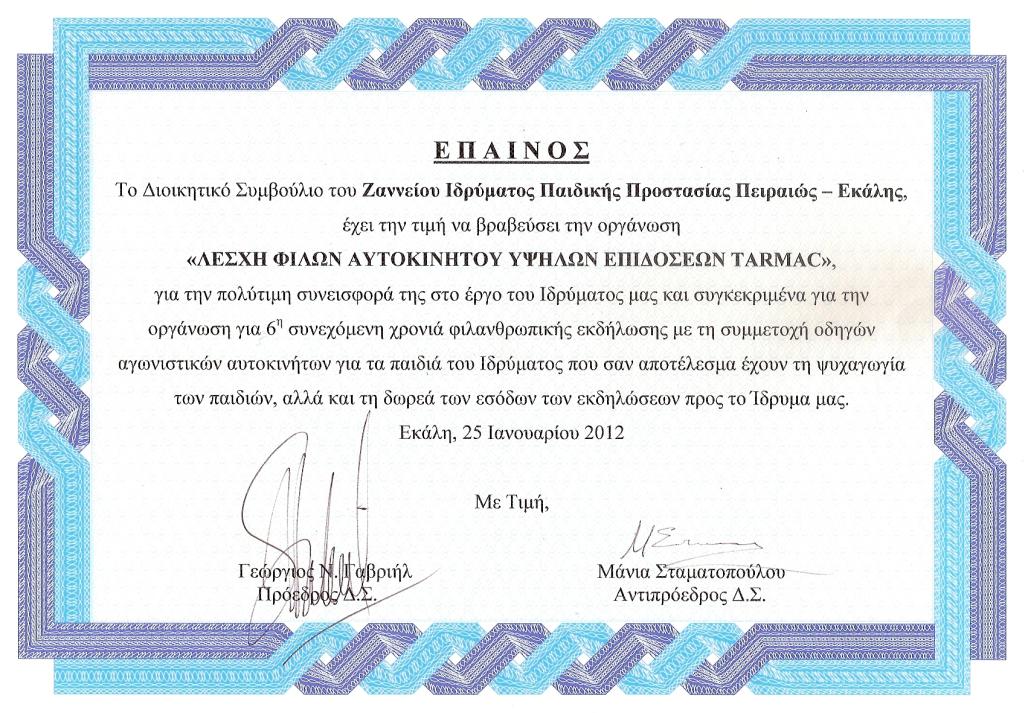 Ηταν μεγάλη η τιμή για μας, που μας απένειμαν Επαινο, για τις Φιλανθρωπικές Εκδηλώσεις των τελευταίων ετών που φιλοξενούσαμε τα παιδιά του Ζαννείου. |